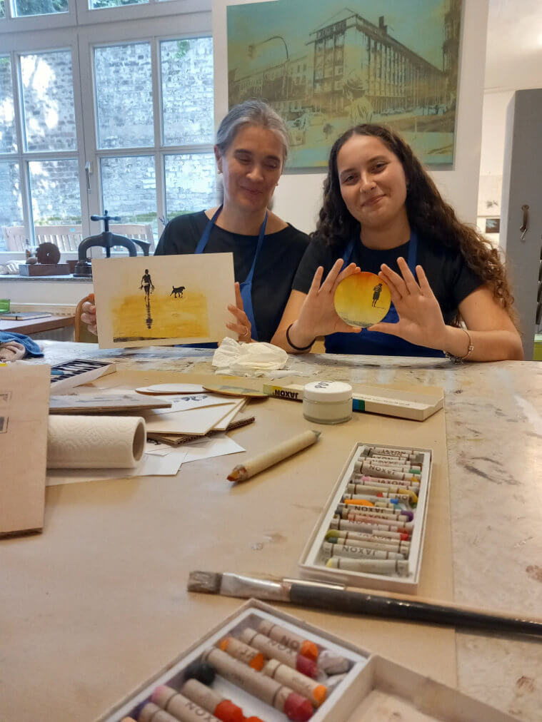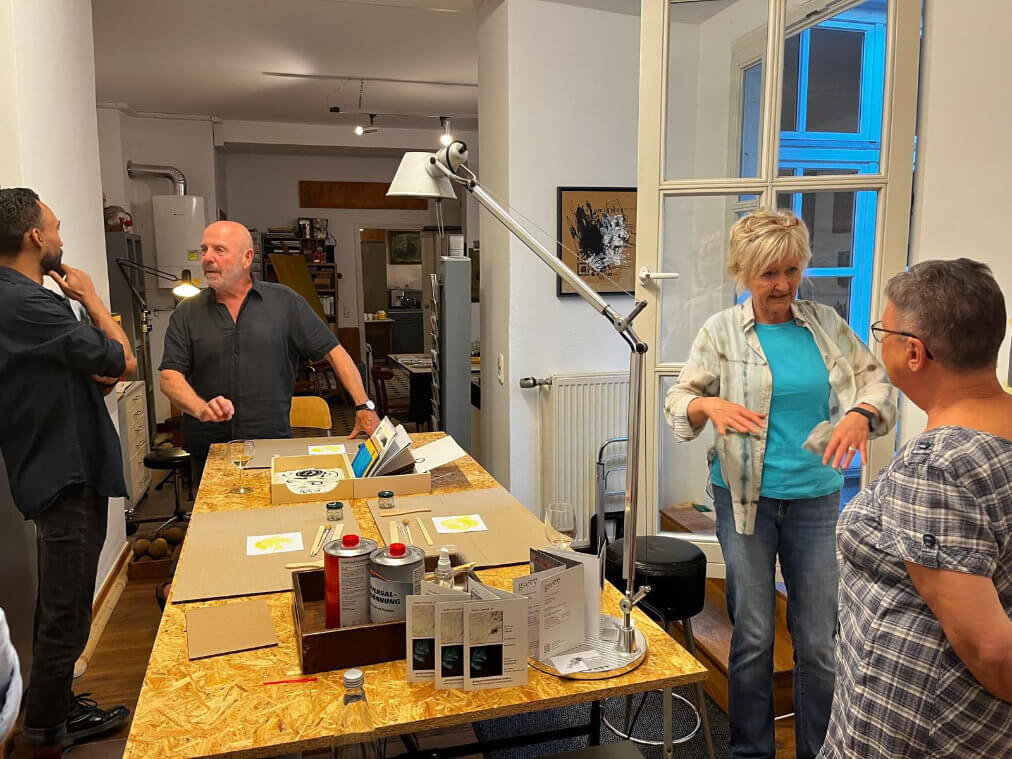 Im zweiten Teil des Abends/der Veranstaltung sind Sie selbst gefragt: Bei einem Impuls-Workshop gibt es die Möglichkeit, in die Transfertechnik einzutauchen – auf Pappe und anderen analogen Trägermaterialien.