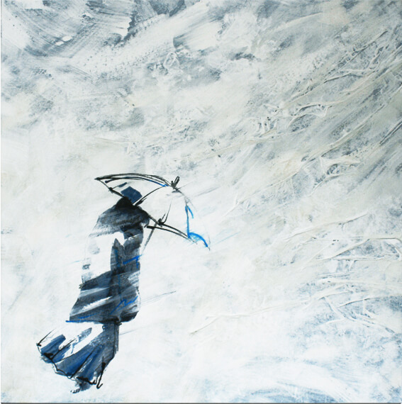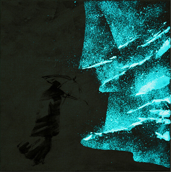 Ein Bild in zwei Phasen. Collage und Acryl auf Leinwand. Silbrig weiße Fläche in struktureller, abstrakter Gestaltung mit vom Sturm gebeugter Figur – türkise Leuchteffekte an Polarlicht erinnernd, erscheinen bei Dunkelheit und verblassen sehr langsam.