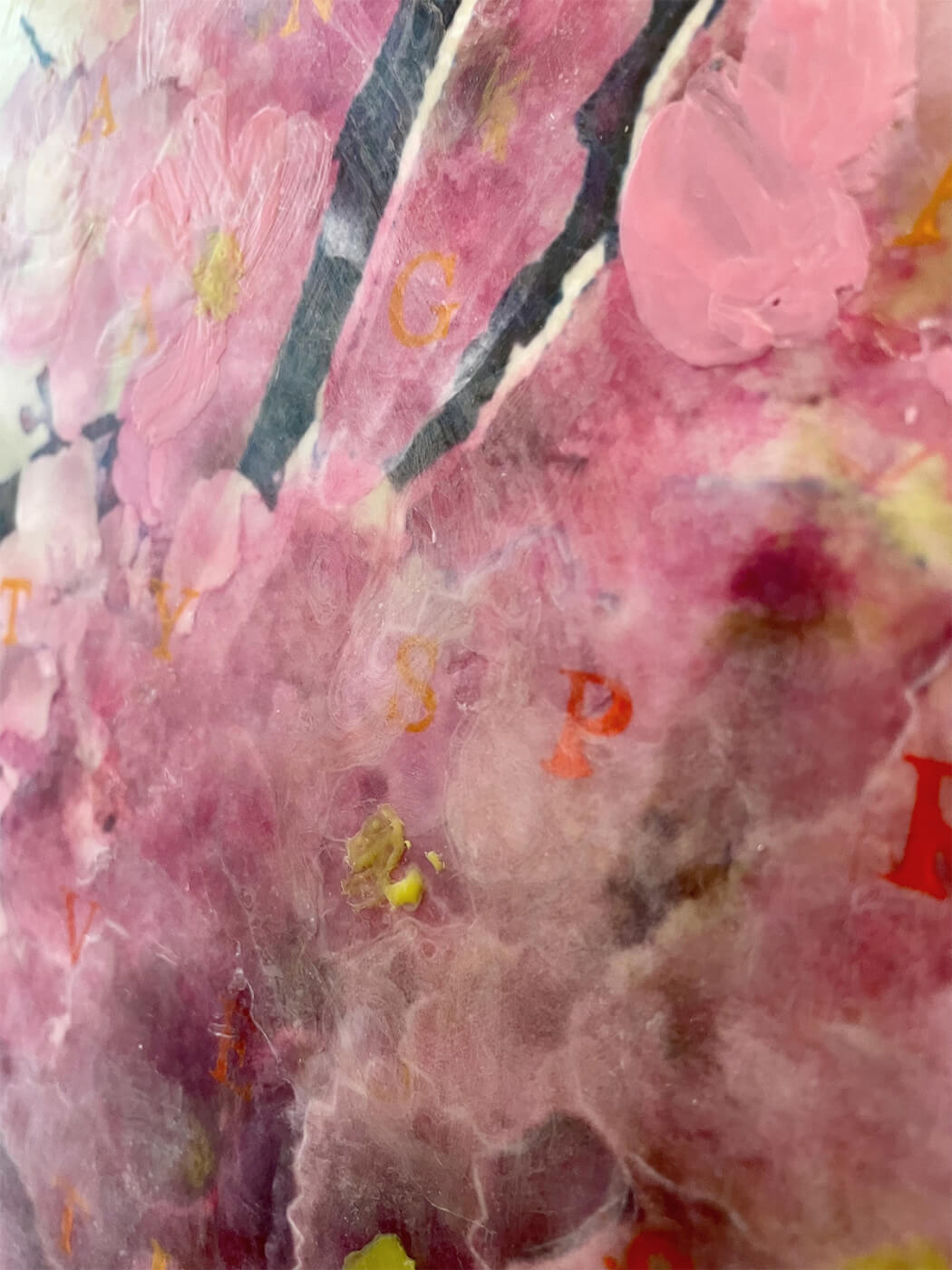 Photoencaustic auf Japanpapier, Tusche, Typoprints, Gouache auf handgeschöpftem Papieren auf Holzboard.