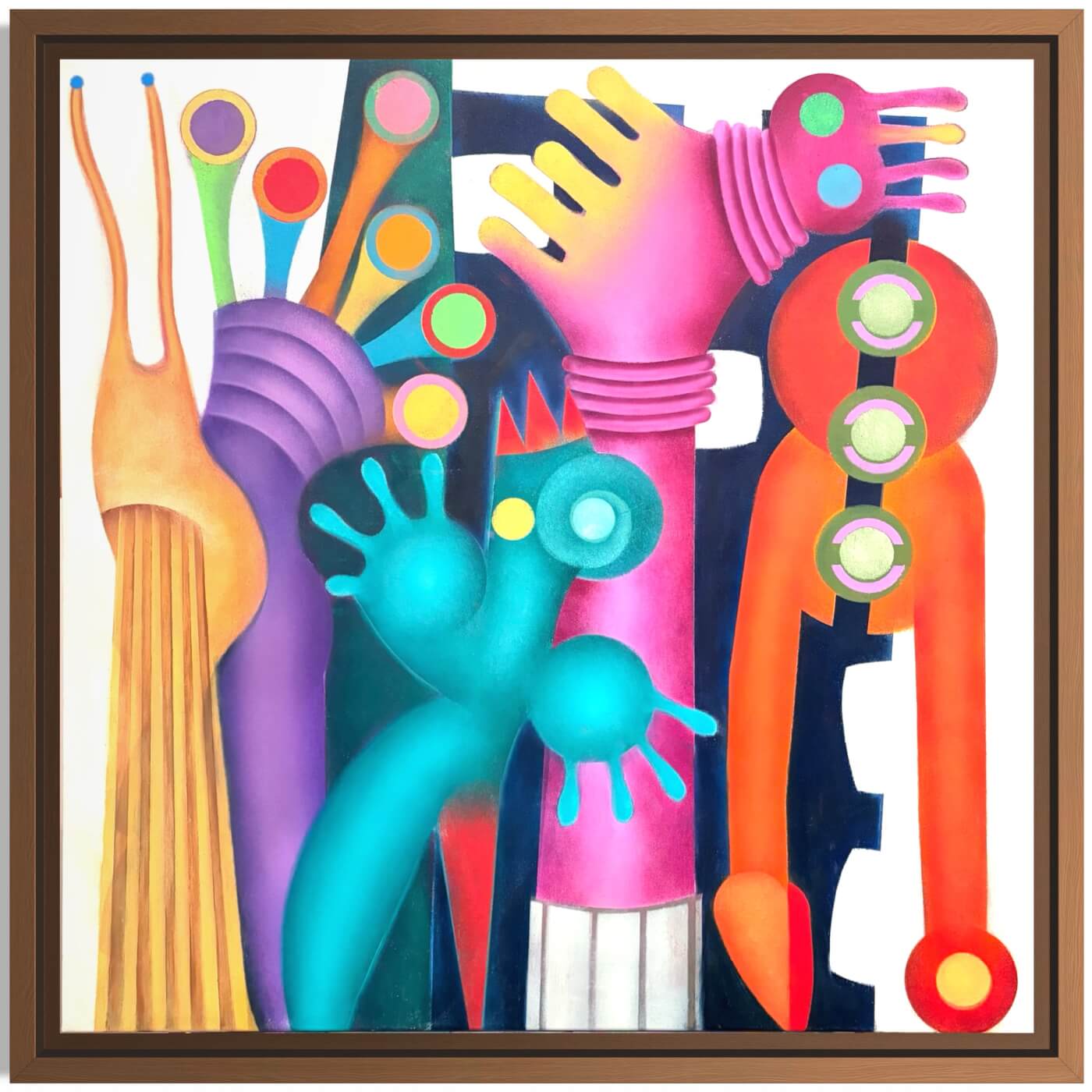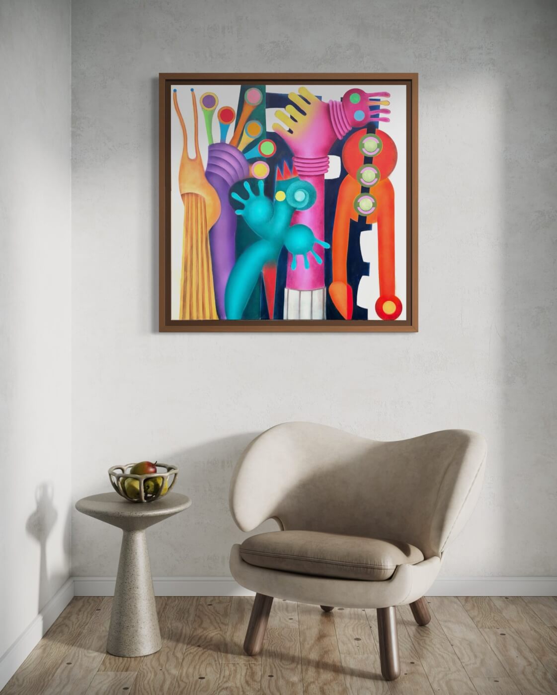 Stage Fright zeigt Figuren, die kurz vor einem Auftritt in gespannter Erwartung stehen. Die bunten Hände, kreisenden Formen und vibrierenden Farben verdichten Nervosität und Vorfreude. Das Bild hält den Moment fest, in dem alles möglich scheint – bevor Bewegung, Blick und Mut sichtbar werden.