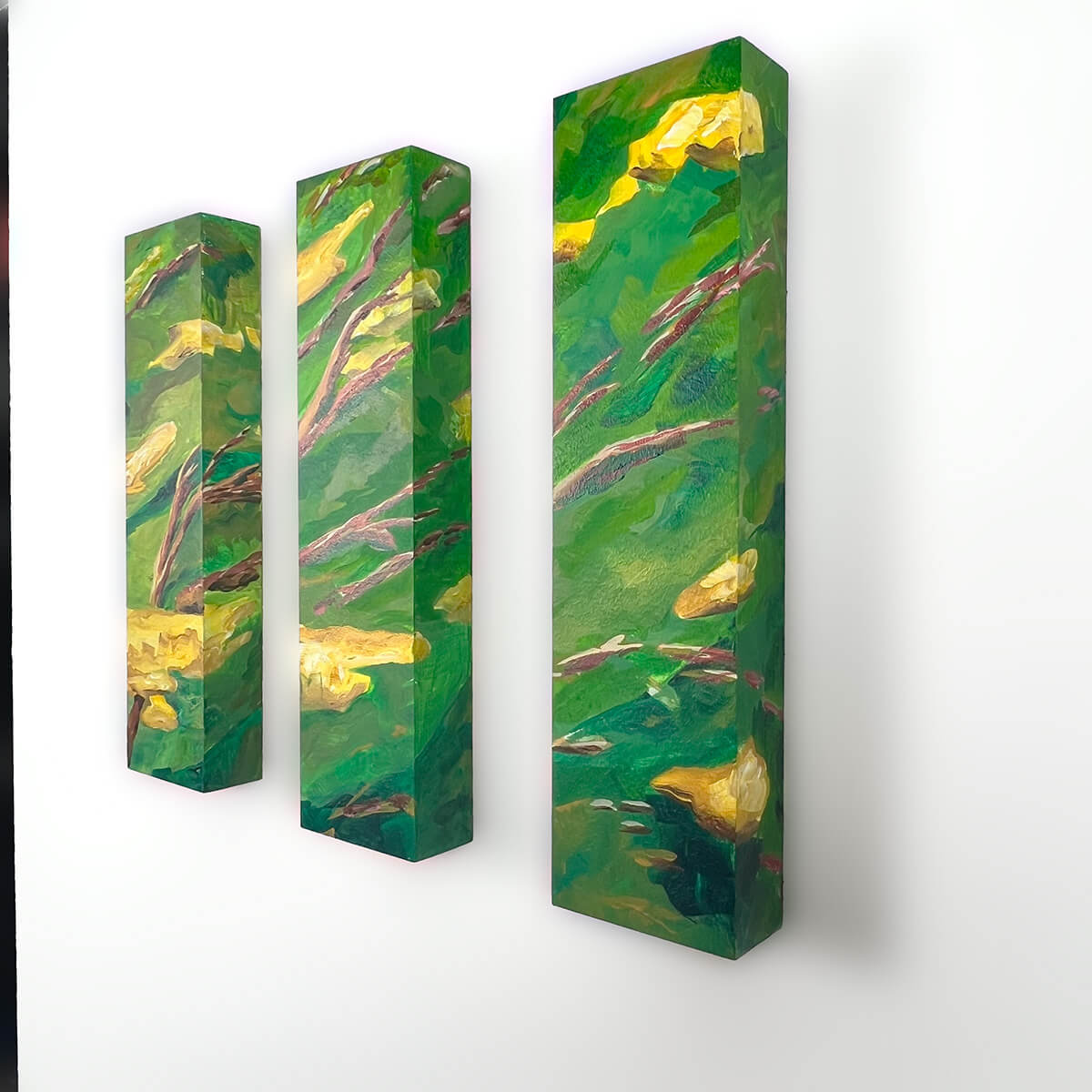 Spannungsvoll leuchten die Farben und bewegen sich scheinbar über den plastischen Holzkörper des Bildträgers. Von vorne wie von den Seiten bemalt sehen wir bewegten Formen, die den Eindruck von Bewuchs in einer Landschaftsszene wecken.