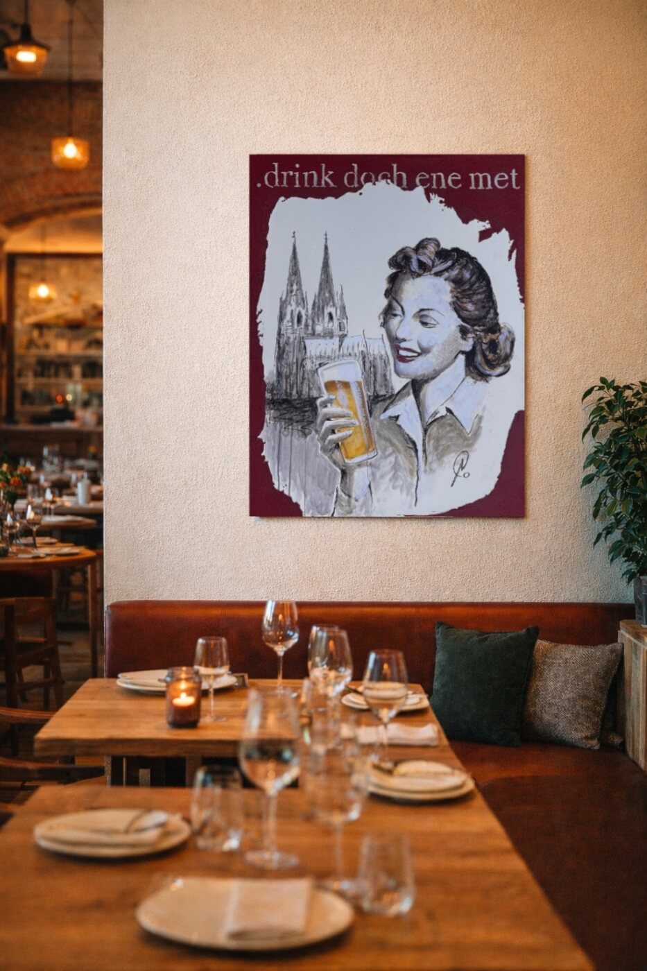 Die dargestellte Frau hält ein Bierglas und blickt leicht seitlich, mit einem offenen, freundlichen Ausdruck. Der Titel „Drink doch ene met“ (Kölsch für „Trink doch einen mit“) verweist auf die rheinische Einladungskultur – eine Mischung aus Humor, Offenheit und sozialer Nähe. (Gleichnamiges Lied von den BläckFöös)