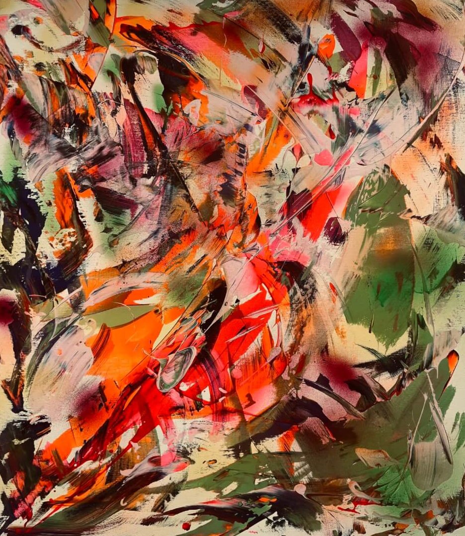 Alles wird in Farbe verwandelt. Alles verschwimmt, kein Anfang und kein Ende scheint erkennbar. Emotionen fliegen oder explodieren auf der Leinwand kreuz und quer. Mal sind es dicke kräftige Rakelspuren, mal sind es zerbrechlich feine Linien die sich im Nichts verlieren. Erst wenn sich alles Empfundene auf der Leinwand widerspiegelt, scheint das Bild zur Ruhe zu kommen.