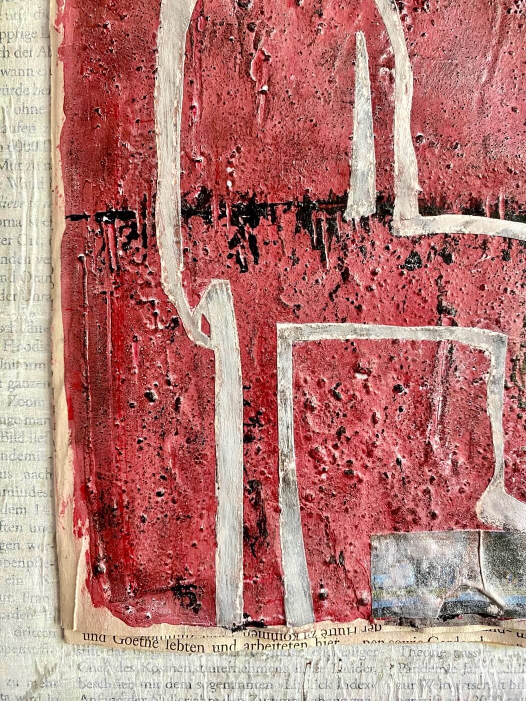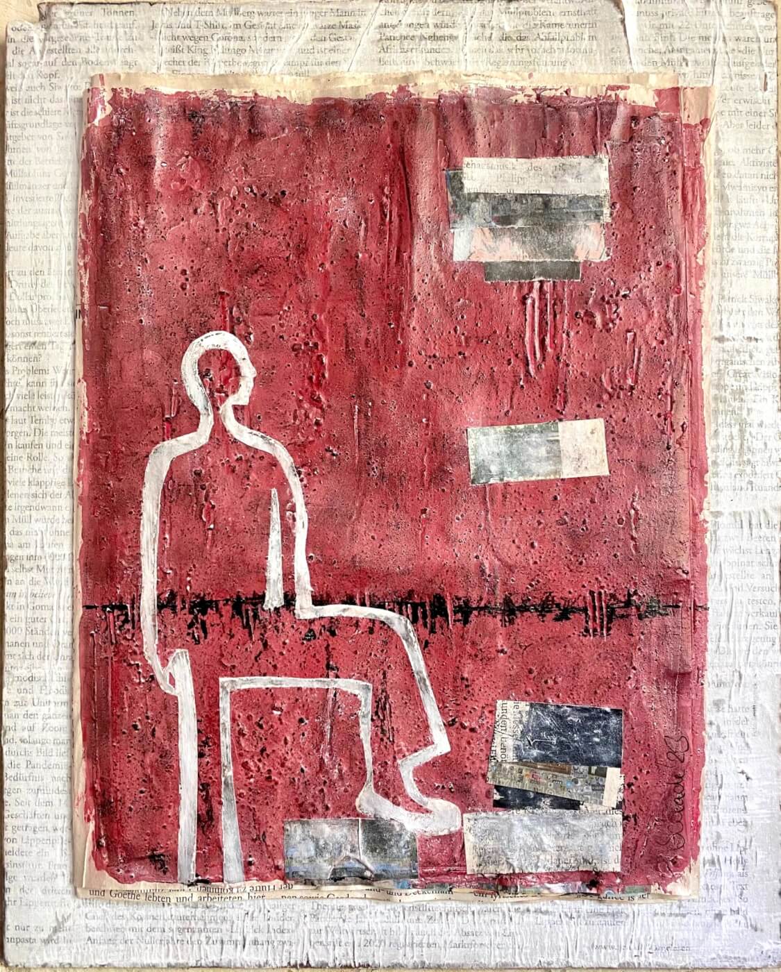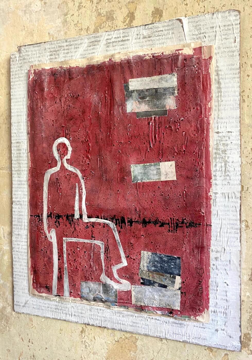 Die Figur bleibt still und beobachtend, fast losgelöst von der farbigen, rauen Umgebung – und doch nimmt sie Kontakt, Blickbeziehung zu den wie fallend wirkenden Formen auf. Insgesamt erzeugt das Werk einen fragilen, brüchigen Eindruck, unterstützt durch die flüchtige Materialität der Zeitungsschichten und dem Kontrast zwischen Kontur und pastosem Farbauftrag.